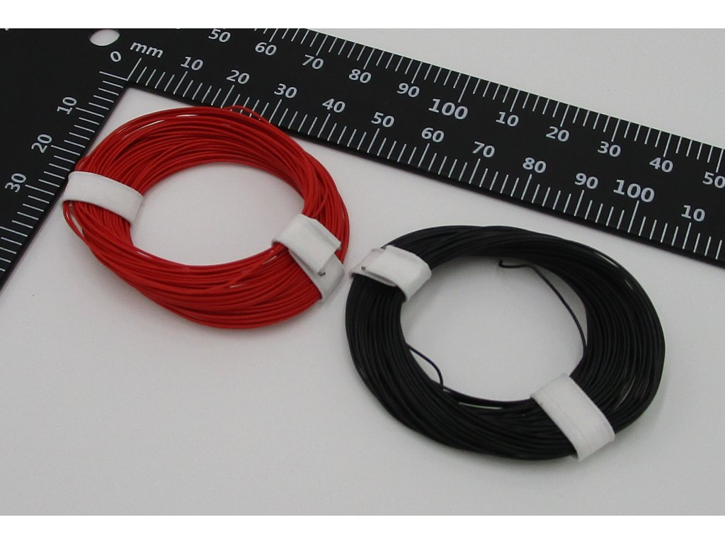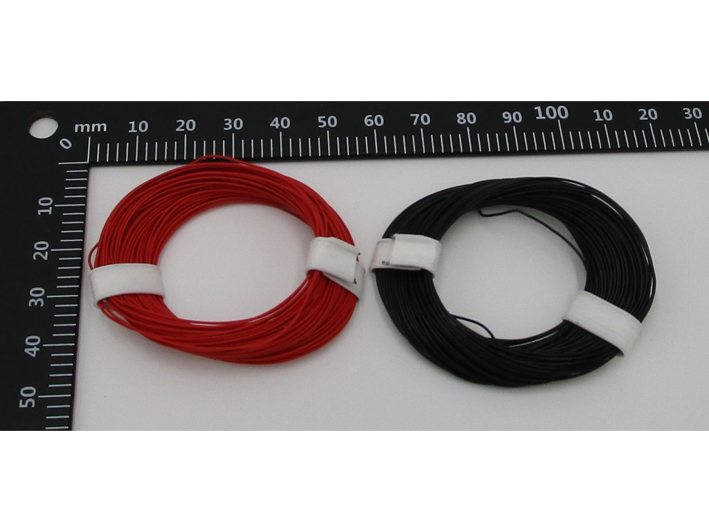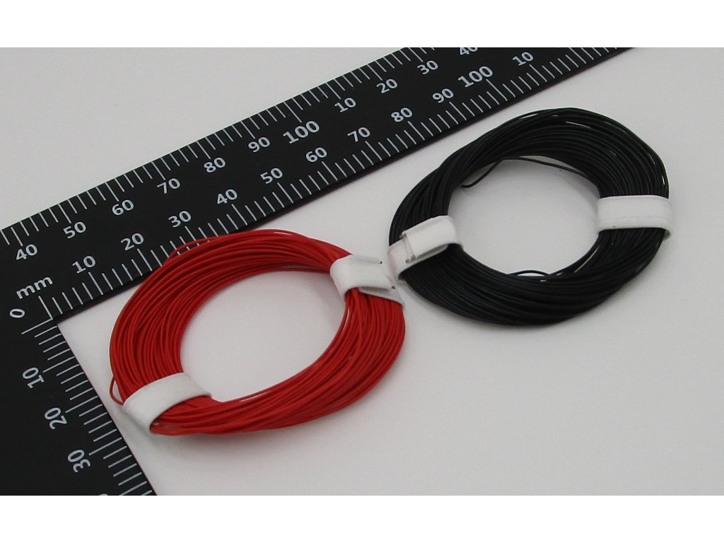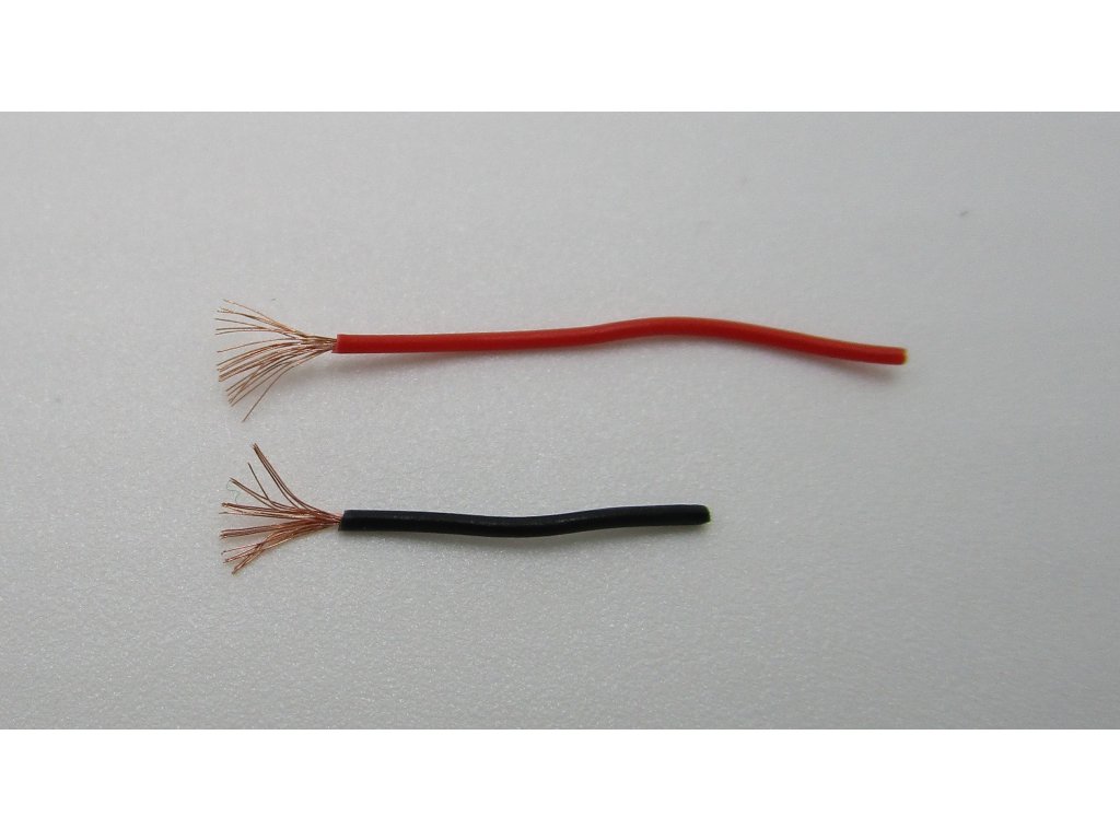 Vysoce flexibilní vodiče (lanko) od výrobce Donau Elektronik, 2 x 10 m, složený z 21 měděných vláken o průměru 0,05 mm. Barva červená a černá.
