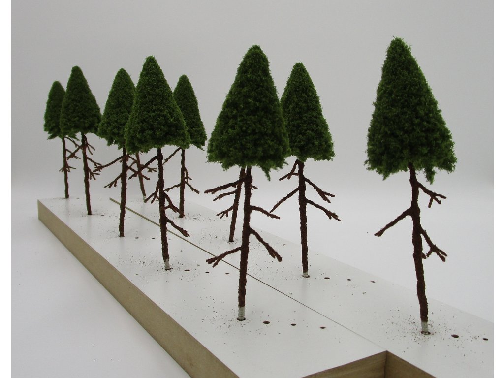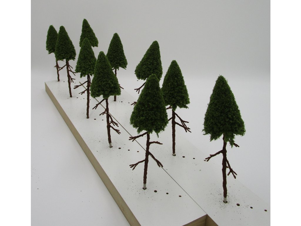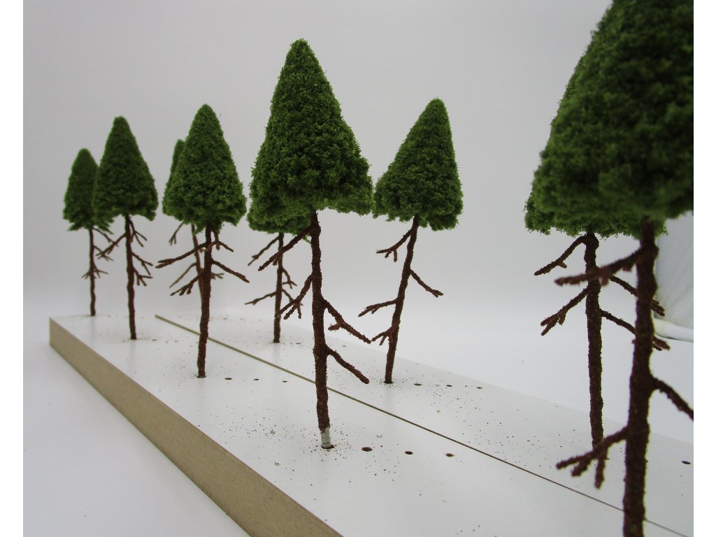 Jehličnatý strom s větvemi o výšce 14 cm nad terénem, patice pro zapíchnutí do polystyrenu 3 cm. V balení 10 ks.