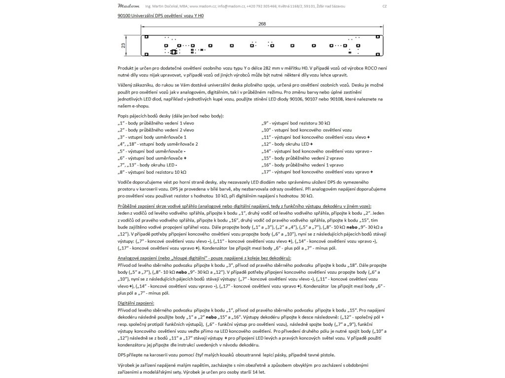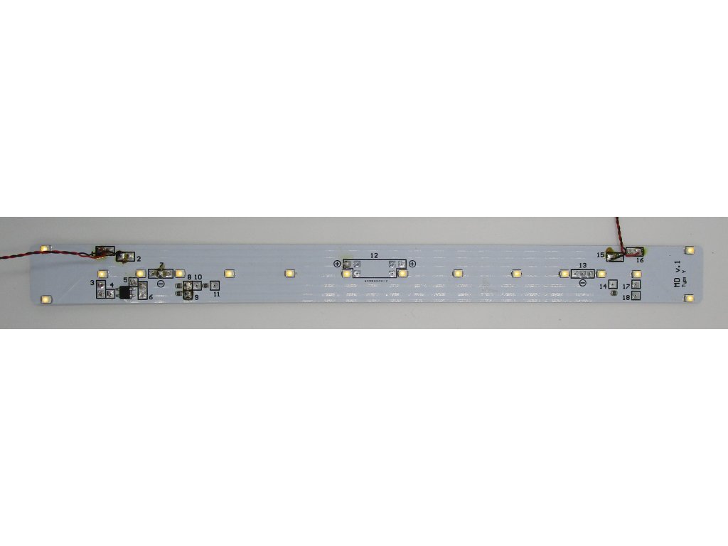 Deska plošného spoje, určená pro osvětlení osobních vozů. Desku je možné použít pro osvětlení vozů jak v analogovém, digitálním, tak i v průběžném režimu. Pro změnu barvy nebo úplné zastínění jednotlivých LED diod, například v jednotlivých kupé vozu, použijte stínění LED diody 90106, 90107 nebo 90108, které naleznete na našem e-shopu.