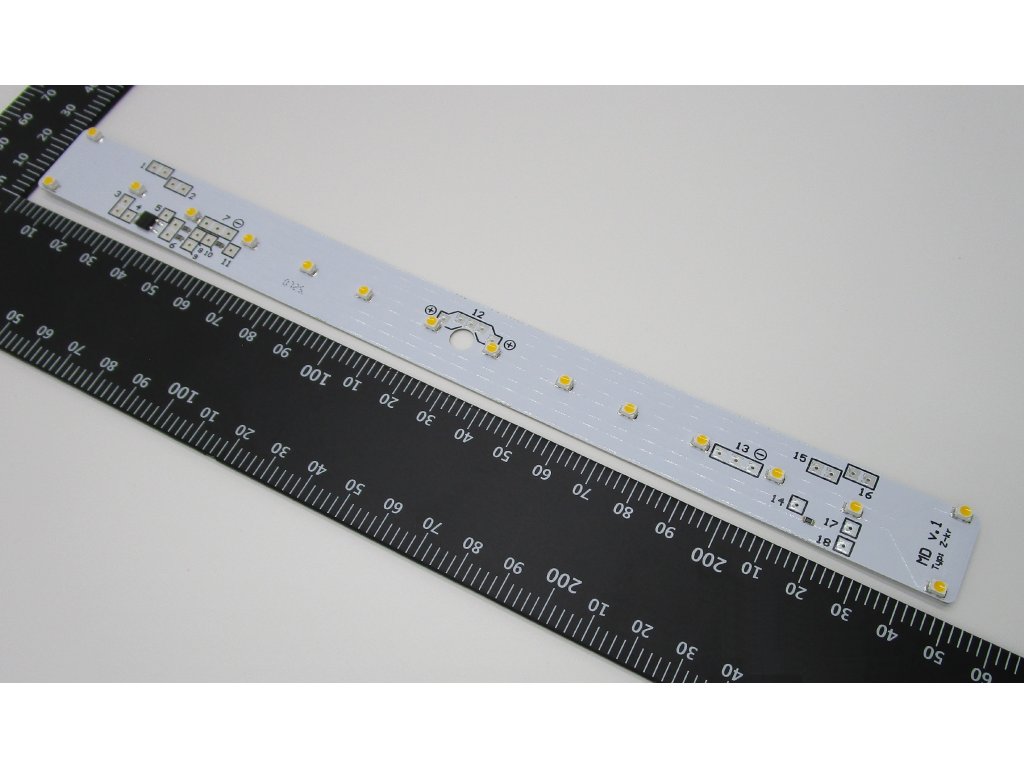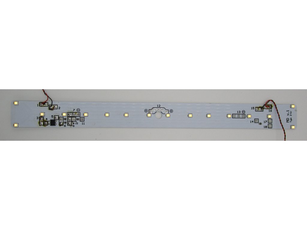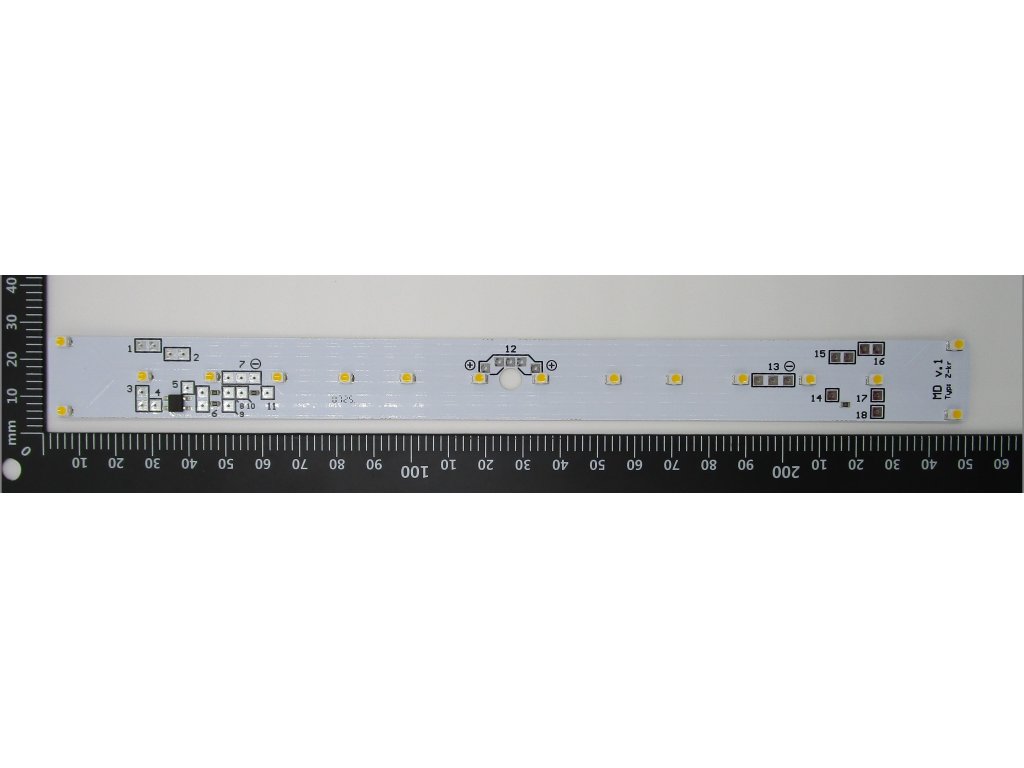 Deska plošného spoje, určená pro osvětlení osobních vozů. Desku je možné použít pro osvětlení vozů jak v analogovém, digitálním, tak i v průběžném režimu. Pro změnu barvy nebo úplné zastínění jednotlivých LED diod, například v jednotlivých kupé vozu, použijte stínění LED diody 90106, 90107 nebo 90108, které naleznete na našem e-shopu.